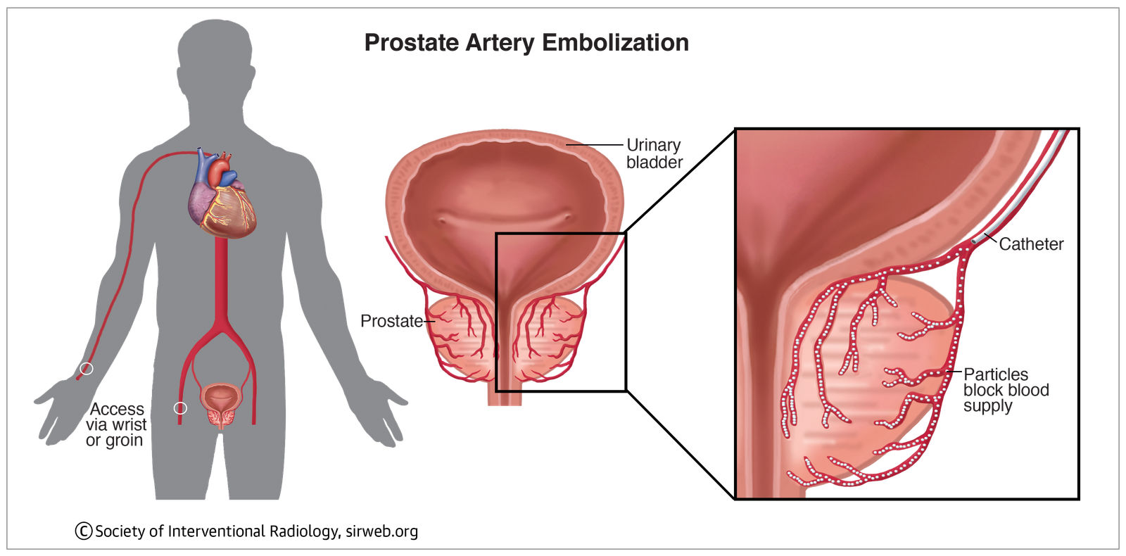 Prostate artery embolization is a minimally invasive treatment for enlarged prostate that does not carry the risk of sexual side effects typically associated prostate surgery. Through image guidance, an interventional radiologist makes a tiny incision in the wrist or groin and guides a very thin catheter (about the size of a strand of spaghetti) through your blood vessels to the artery that supplies blood to the prostate. Once in position, the doctor releases small particles to deprive those prostate cells of oxygen, resulting in the gland’s shrinkage. When embolization is completed, the catheter is removed, and pressure is applied to the small incision to allow it to heal.