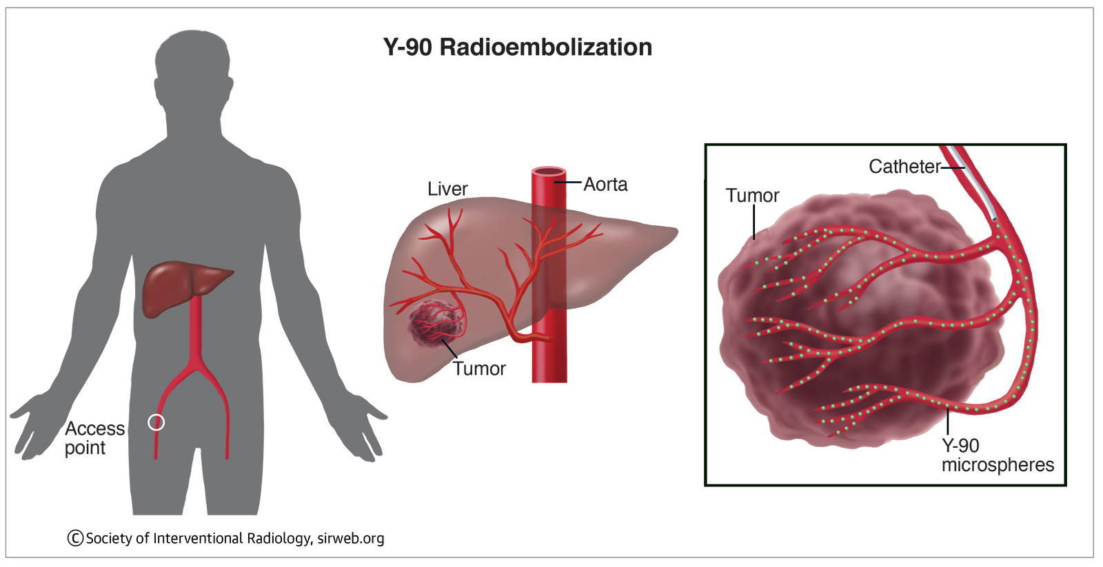Radioembolization or selective internal radiation therapy (SIRT), is a treatment used to destroy tumors. The doctor makes a tiny cut in the skin and inserts a catheter (a thin, flexible tube) into the femoral artery (the large artery of the leg). The catheter is then maneuvered into place, guided by live X-rays. Once at the tumor site, the doctor injects the radioactive beads into the blood vessels that supply the tumor. The beads give off radiation over a very short distance, which concentrates the radiation inside the tumor, helping to reduce radiation exposure to the rest of the body. This treatment may also be referred to as Y-90 because it commonly uses a radioactive isotope called yttrium 90.